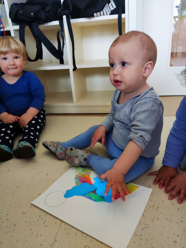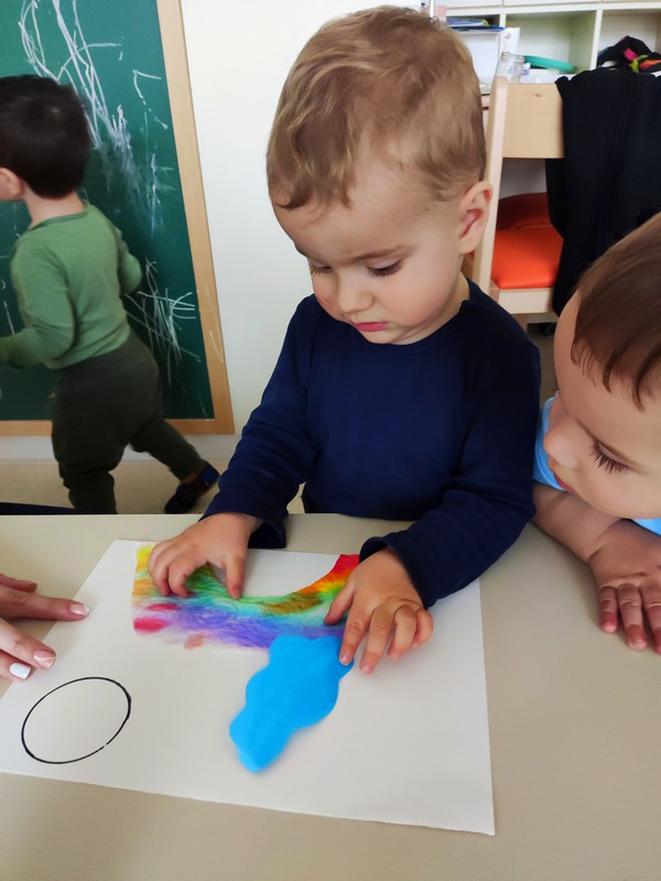 Ustvarjali smo tudi s flomastri. Naredili smo poskus, kaj se zgodi, če pobarvamo papir s flomastri in ga damo v vodo. Na naše presenečenje je nastala čisto prava mavrica. Nato so otroci z našo pomočjo narisali črte s flomastri na papirnato brisačo in jo zmočili z vodo. Vsak otrok je naredil svojo mavrico. Ko so se mavrice posušile, je sledilo nadaljevanje našega ustvarjanja. Otroci so lepili papir in tiskali z rumeno in modro barvo in na koncu je nastala slika aprilskega vremena. Naše čudovite slike sedaj krasijo pano v hodniku vrtca, kjer si lahko obiskovali pogledajo našo razstavo.