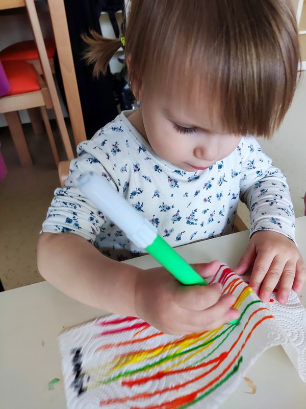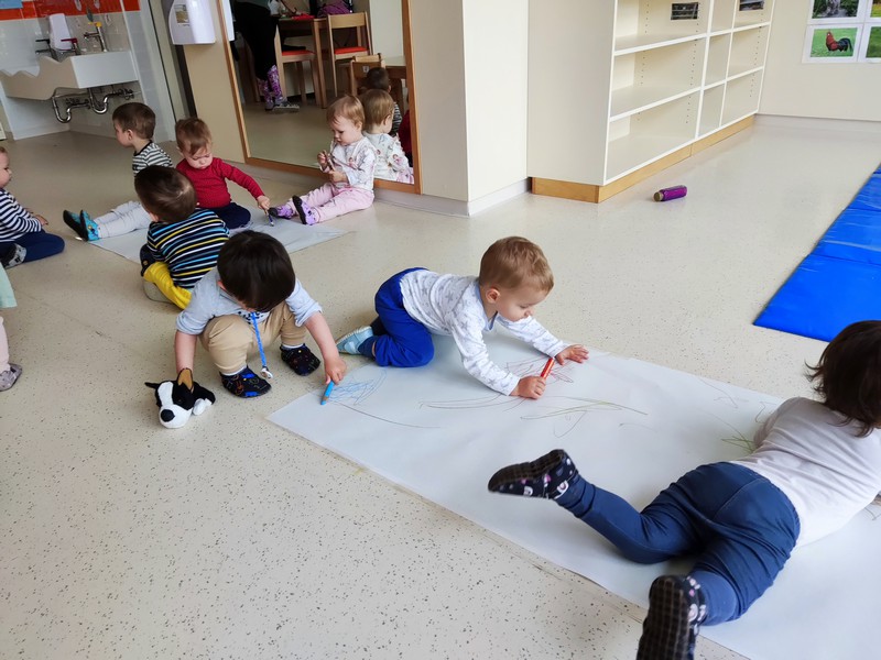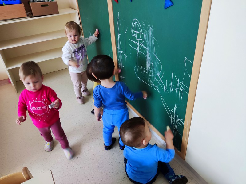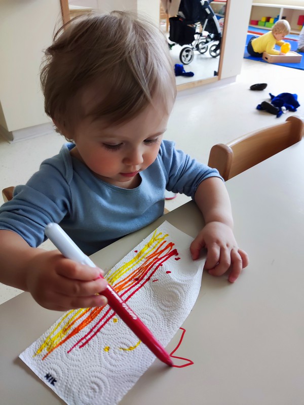 Otroci so ustvarjali tudi s suhimi barvicami in risali na velik format papirja in z barvnimi kredami po tabli. Najbolj zanimivo jim je opazovati, kako barvice puščajo sledi na papirju, tabli, tleh in celo na telesu. Kadar ustvarjamo na večji format, se lahko otroci uležejo ali usedejo na tla, se prepustijo ustvarjanju in neovirano rišejo črte, krožnice in krepijo grobo motoriko, koordinacijo in koncentracijo.