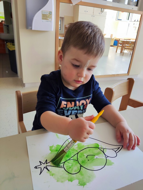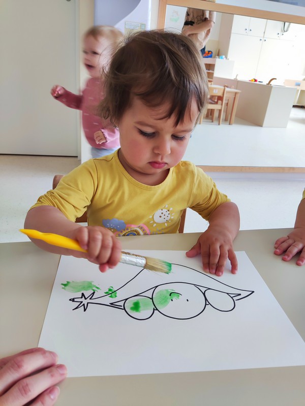 In ker ga ni čez packanje in čofotanje po vodi in barvi, smo slikali tudi z vodenimi barvami. Otroci so likovno poustvarjali po zgodbi Grahek, Amy Krouse Rosenthal. Pobarvanko grahka so poslikali s čopičem v zeleno, modrih in rumenih odtenkih.