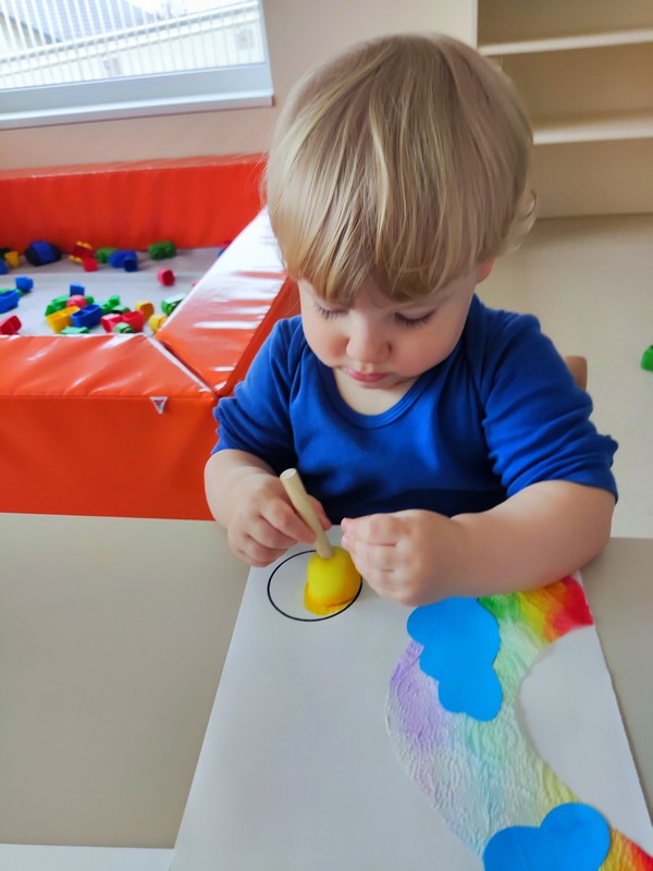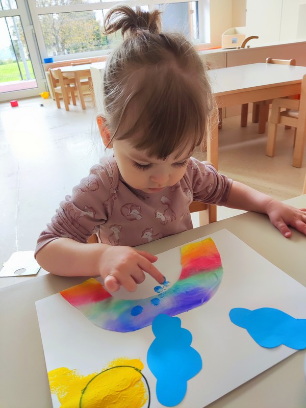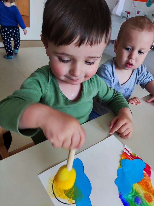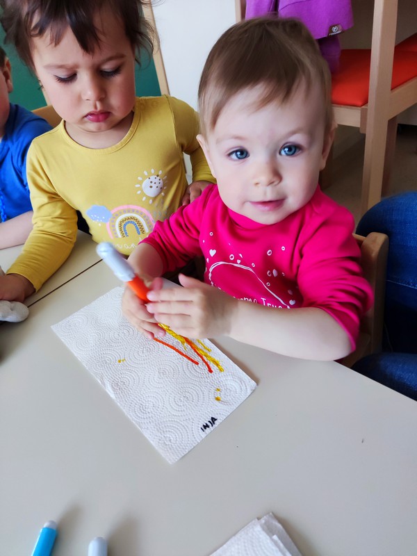 Ustvarjali smo tudi s flomastri. Naredili smo poskus, kaj se zgodi, če pobarvamo papir s flomastri in ga damo v vodo. Na naše presenečenje je nastala čisto prava mavrica. Nato so otroci z našo pomočjo narisali črte s flomastri na papirnato brisačo in jo zmočili z vodo. Vsak otrok je naredil svojo mavrico. Ko so se mavrice posušile, je sledilo nadaljevanje našega ustvarjanja. Otroci so lepili papir in tiskali z rumeno in modro barvo in na koncu je nastala slika aprilskega vremena. Naše čudovite slike sedaj krasijo pano v hodniku vrtca, kjer si lahko obiskovali pogledajo našo razstavo.