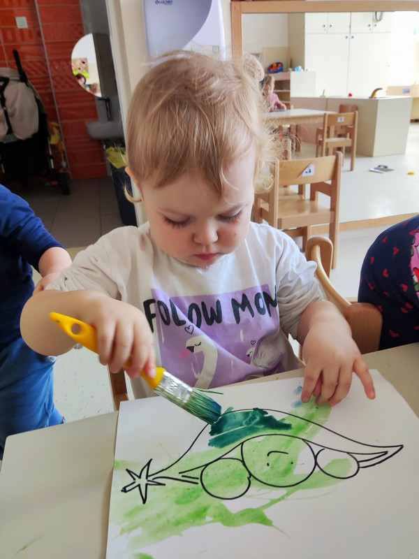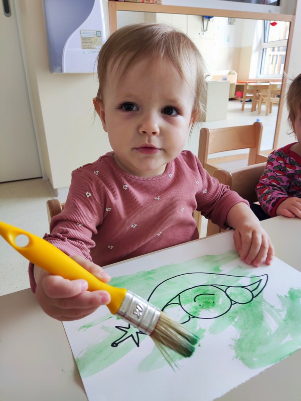 In ker ga ni čez packanje in čofotanje po vodi in barvi, smo slikali tudi z vodenimi barvami. Otroci so likovno poustvarjali po zgodbi Grahek, Amy Krouse Rosenthal. Pobarvanko grahka so poslikali s čopičem v zeleno, modrih in rumenih odtenkih.