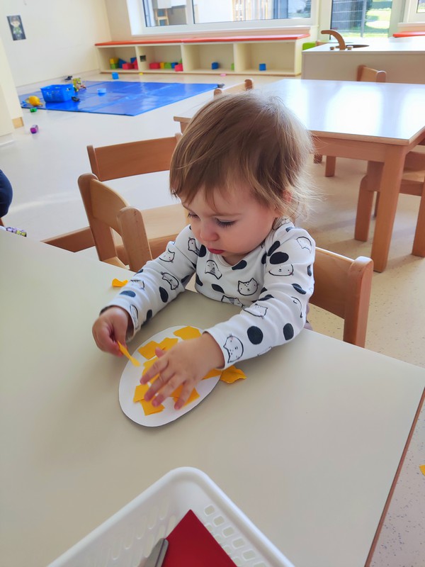 Na začetku meseca smo v vrtec povabili mamice in babice, ki so nam pomagale ustvarjati velikonočno dekoracijo. Ustvarjali smo piščančke. Na tršo podlago smo nanesli lepilo, otroci pa so lepili koščke rumenega papirja na podlago. Ko so zaključili z lepljenjem, so prilepili še kljun, čopko, noge ter oči in nastal je piščanec.