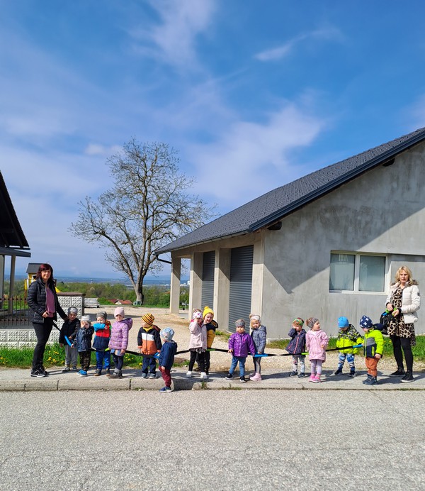 Zelo veliko se gibamo v naravnem okolju. Naš vrtec stoji na gričku s čudovito okolico, zato pogosto hodimo na sprehode in občudujemo lepote narave. Hkrati pa otroke navajamo na pravilno prečkanje skozi prehod za pešce in na varno hojo po pločniku in robu cestišča. Med hojo otroci razvijajo predvsem ravnotežje in koordinacijo celega telesa.