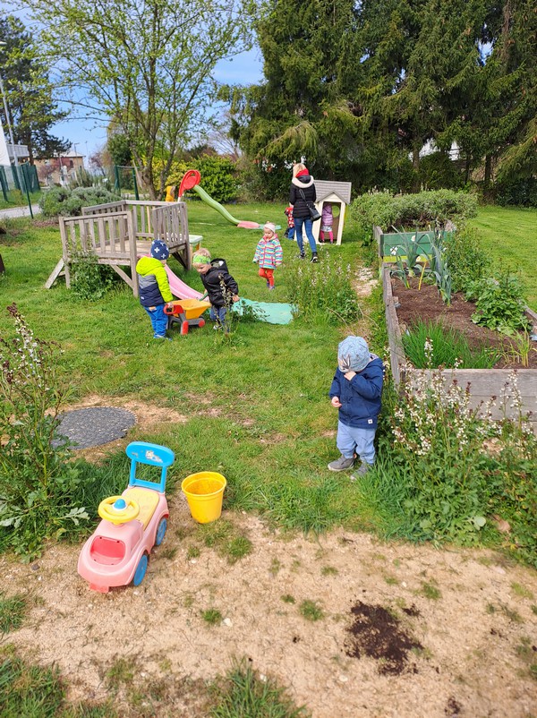 Po ustvarjanju in igri v igralnici se odpravimo v garderobo, kjer se pripravimo za bivanje in dejavnosti na prostem. Otroke spodbujava, da sami sezujejo copate, jih pospravijo na svoj znak in sami poskušajo obuti čevlje ter obleči jaknico. Pri tem urijo motorične spretnosti in socialne veščine, saj si pri tem med sabo tudi pomagajo.