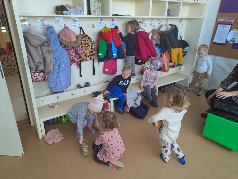 Po ustvarjanju in igri v igralnici se odpravimo v garderobo, kjer se pripravimo za bivanje in dejavnosti na prostem. Otroke spodbujava, da sami sezujejo copate, jih pospravijo na svoj znak in sami poskušajo obuti čevlje ter obleči jaknico. Pri tem urijo motorične spretnosti in socialne veščine, saj si pri tem med sabo tudi pomagajo.