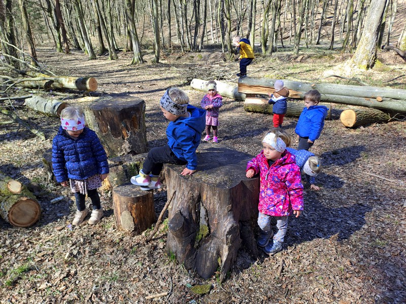 Seveda pa ne smemo pozabiti na naš gozd, Banovo hosto. Ta nam ponuja veliko možnosti gibanja v naravnem okolju. Ko vstopimo skozi gozdna vrata, se otroci spremenijo v marljive mravljice. Takoj začnejo delati. Nekateri pobirajo vejice in listje, lezejo po odmrlih deblih, plezajo na štore,…Drugi pa že stečejo do brežine, kjer se spuščajo, plezajo, potiskajo, vlečejo, skačejo,…in še mnogo, mnogo drugih stvari, ki jih gozd ponuja.