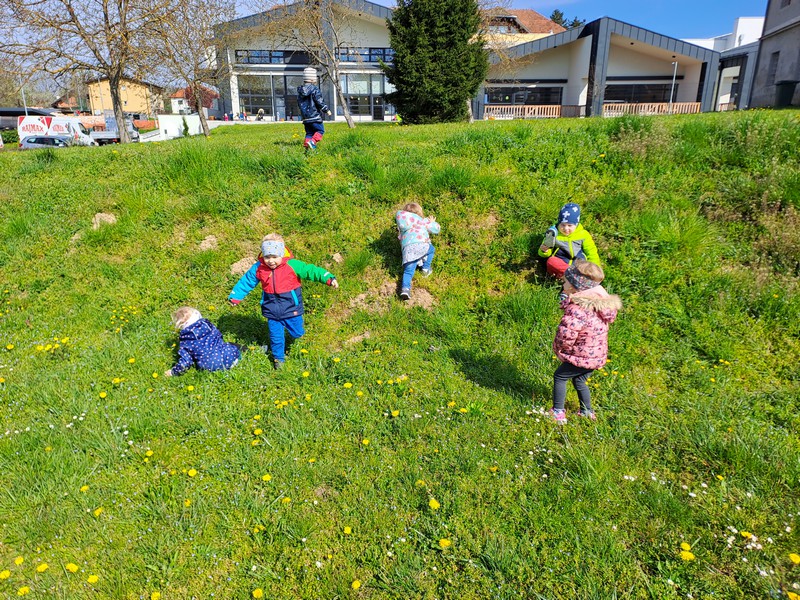 Ustavimo se tudi na travniku, ki nam ponuja veliko možnosti za raziskovanje in gibanje. Tukaj otroci opazujejo rožice, mravljice, čebelice, metulje,…Na tem travniku pa je tudi manjša brežina, kjer se otroci zelo radi vzpenjajo in potem tudi spuščajo na različne načine. Nekateri se kotalijo, drsajo po zadnjici, hodijo ali pa se spomnijo še česa drugega. Saj veste, da otroška domišljija ne pozna meja. Potem pa se je potrebno preizkusiti še v teku po travniku in sicer od enega do drugega gola.
