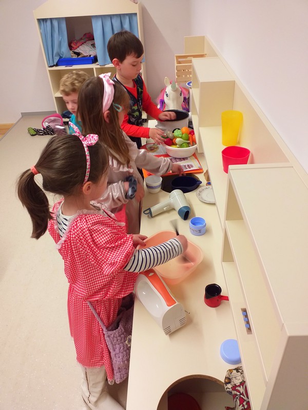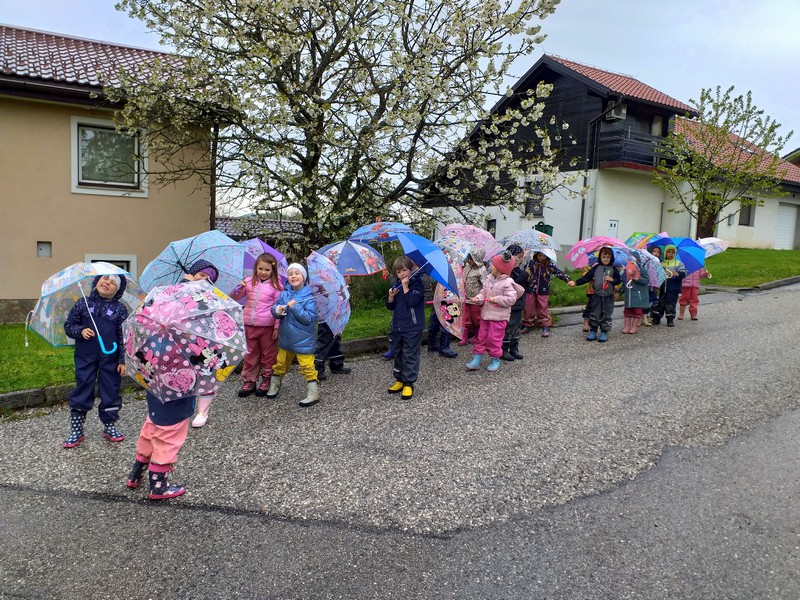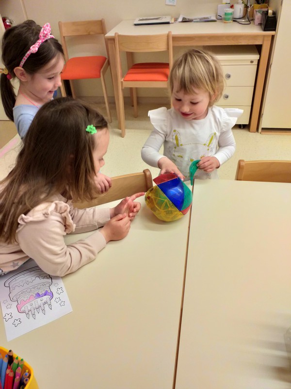 V naslednjih dneh smo še večkrat pomislili na zaklad. Deklica je nekaj skrila v figuro iz magnetov, da smo ugotavljali ali se v njej skriva zaklad. Na podestu smo kuhali juho in čaj, pekli palačinke, previjali ter preoblačili dojenčke. V likovnem kotičku smo risali spomladanske motive in mešali barve, iz katerih so nastali pisani zakladi. Vzgojiteljica nas je spomnila, da je zaklad tudi, ko imaš nekoga rad. Zato smo si Igralčki podali roke, razprli dežnike in se v dežju odpravili na sprehod. Seveda smo se strinjali, da je tudi praznovanje rojstnega dne v gozdu lahko zaklad, saj se takrat posladkamo in zarajamo s prijatelji.