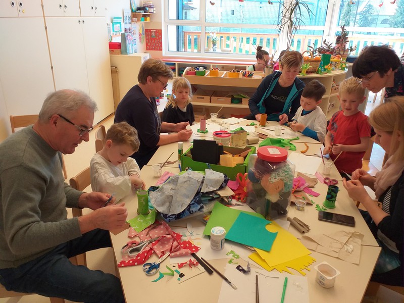 V začetku meseca aprila smo se pripravljali na velikonočne praznike. Medse smo povabili mamice, babice in dedke, ki so nam pomagali pri izdelavi zajčkov iz blaga ter papirnatih košaric in rožic.