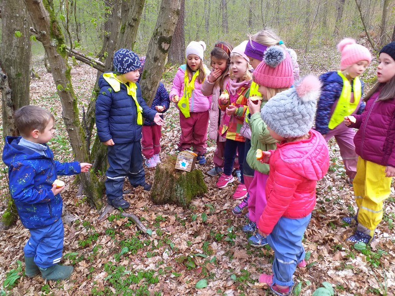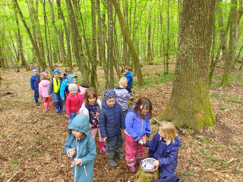 Naslednji dan smo se odpravili v gozd iskati zaklad, saj nam je tako na uho prišepnil velikonočni zajček. Ker ga vsi nismo razumeli in nismo bili povsem prepričani, kaj moramo iskati, smo sledili vzgojiteljici, ki nas je vodila po Banovi hosti vse do Smaragdnega gozda. Med potjo smo pozorno opazovali okolico in razmišljali. Kaj je zaklad? Zaklad so biseri, kronice, čokolada, bonboni, lizike, cekini, gusarska skrinja. Pot je bila zelo zanimiva, saj smo opazili različna drevesa, zelena in brez listja, rožice, bele in rozaste, občutili iglice, trnje in mehko listje, slišali petje ptic. Hm, le kaj in kje je zaklad? Vzgojiteljica nas je prepričevala, da je zaklad lahko sprehod na svežem zraku in igra v gozdu, da je zaklad sadna malica. In takrat je deklica na štoru odkrila majhno skrinjico, ki smo jo previdno odprli. Ja, v njej je bil pravi zaklad papirnatih zajčkov, v njih pa čokoladni jajčki!
