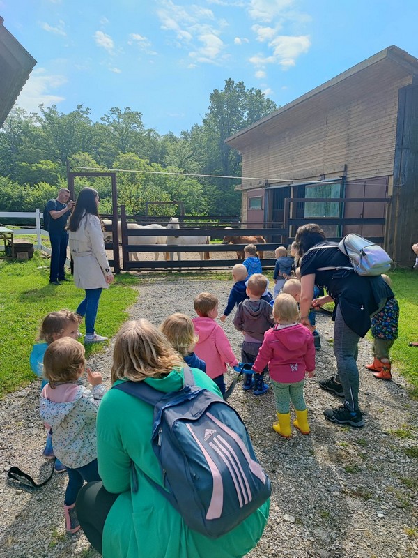 Le teden kasneje smo se odpravili na pohod skozi gozd do bližnje kmetije, kjer smo si ogledali konje. Otroci so imeli priložnost spoznati in se na nek način povezati s temi čudovitimi živalmi.