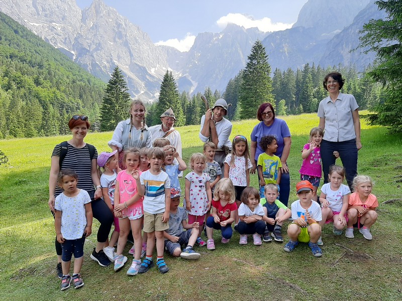 Na travniku smo se nastavljali fotoaparatom in si ogledovali visoke gore, na katerih je ponekod še sneg. Kmalu se nam je pridružila teta Pehta, ki pa ni bila tako grozna kot v filmu, ki smo si ga ogledali v vrtcu. Povabila nas je v svojo kočo, kjer smo se lahko po zabavnem toboganu spuščali med koze. Teta Pehta nam je pripravila zeliščni čaj in kruh za pogum.