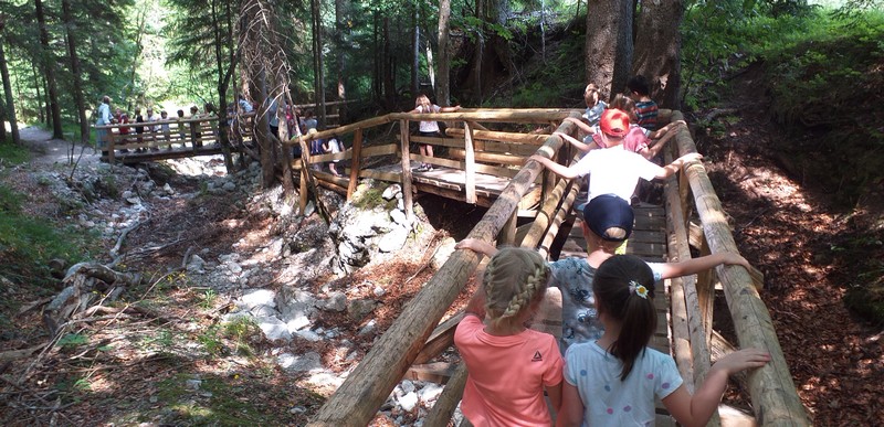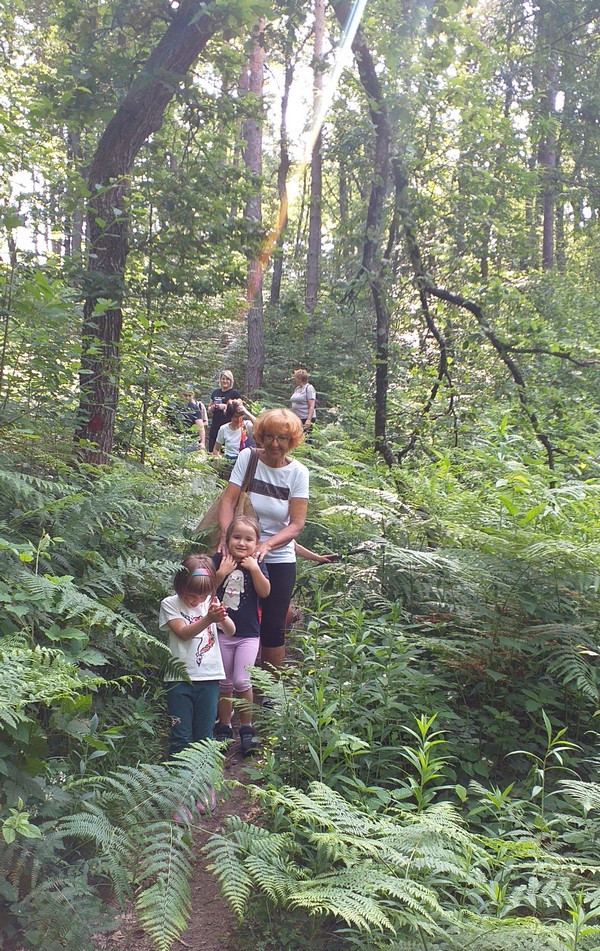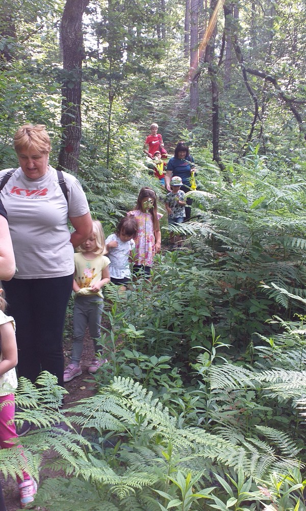 Posebej zadovoljni smo bili, ko so se nam v četrtek, 15. 6. 2023, na poti do Smaragdnega gozda pridružile babice in dedek ter mamica in ati. Ker gozda že nekaj časa nismo obiskali, je bila pot precej zaraščena s praprotjo in ponekod trnjem. Vendar so nam babice in dedek pot ves čas odstirali ter nabirali borovnice, mi pa smo jim pokazali, kje prisluhnemo žvrgolenju ptic in žuborenju potoka. Preden obiščemo Smaragdni gozd se ustavimo pri potoku in opazujemo, kdaj ga bomo lahko prečkali.