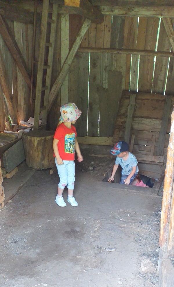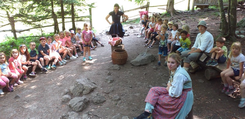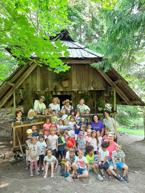 Na travniku smo se nastavljali fotoaparatom in si ogledovali visoke gore, na katerih je ponekod še sneg. Kmalu se nam je pridružila teta Pehta, ki pa ni bila tako grozna kot v filmu, ki smo si ga ogledali v vrtcu. Povabila nas je v svojo kočo, kjer smo se lahko po zabavnem toboganu spuščali med koze. Teta Pehta nam je pripravila zeliščni čaj in kruh za pogum.
