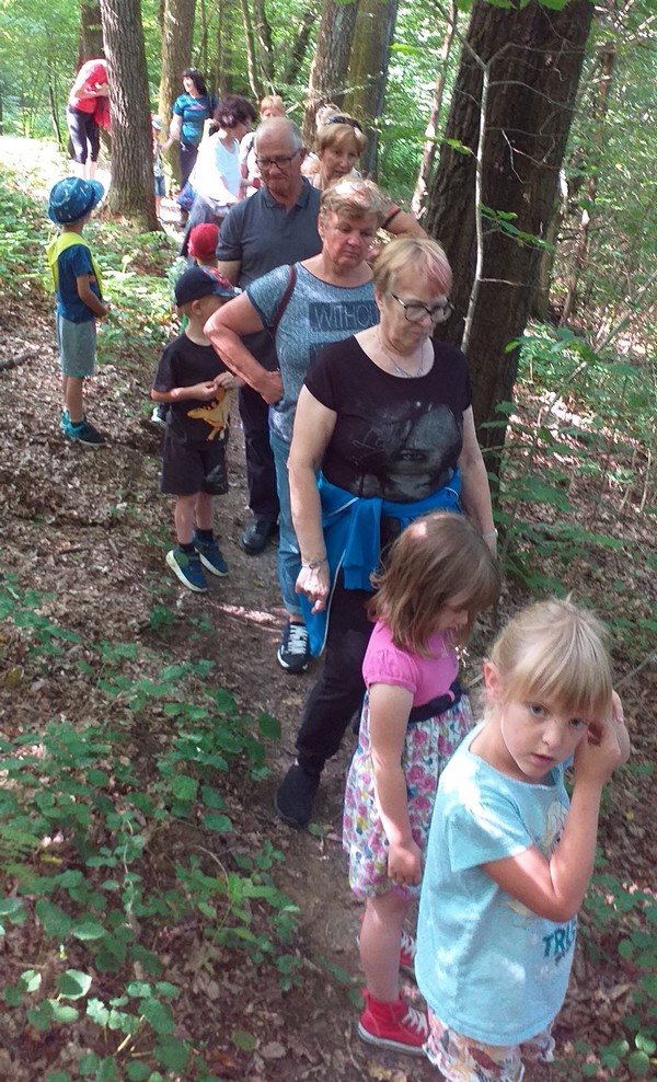 Posebej zadovoljni smo bili, ko so se nam v četrtek, 15. 6. 2023, na poti do Smaragdnega gozda pridružile babice in dedek ter mamica in ati. Ker gozda že nekaj časa nismo obiskali, je bila pot precej zaraščena s praprotjo in ponekod trnjem. Vendar so nam babice in dedek pot ves čas odstirali ter nabirali borovnice, mi pa smo jim pokazali, kje prisluhnemo žvrgolenju ptic in žuborenju potoka. Preden obiščemo Smaragdni gozd se ustavimo pri potoku in opazujemo, kdaj ga bomo lahko prečkali.