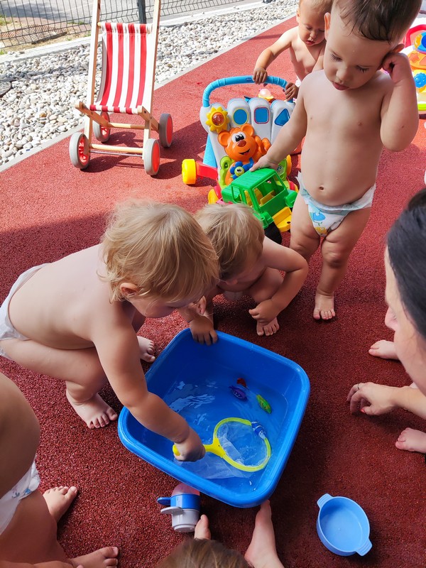 Ko pa je bil sonček za nas že premočan, pa smo se umaknili na teraso, kjer smo nadaljevali z igro z različnimi vozili, ustvarjanjem klobučkov, sončkov, igranjem vremenskega spomina ter seveda vodno zabavo z vodnimi baloni, lovljenjem ribic z mrežico ter poležavanjem na “plaži”.