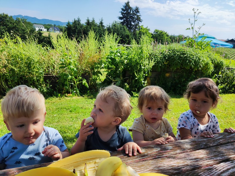 Pogosto smo se odpravljali na sprehod do igrišča, kjer smo se igrali v peskovniku, hiški, se gugali, vozili po toboganu in malicali kar na travniku.