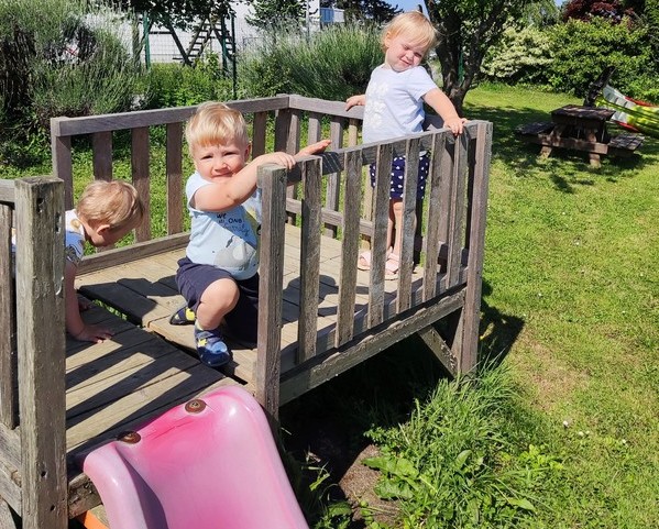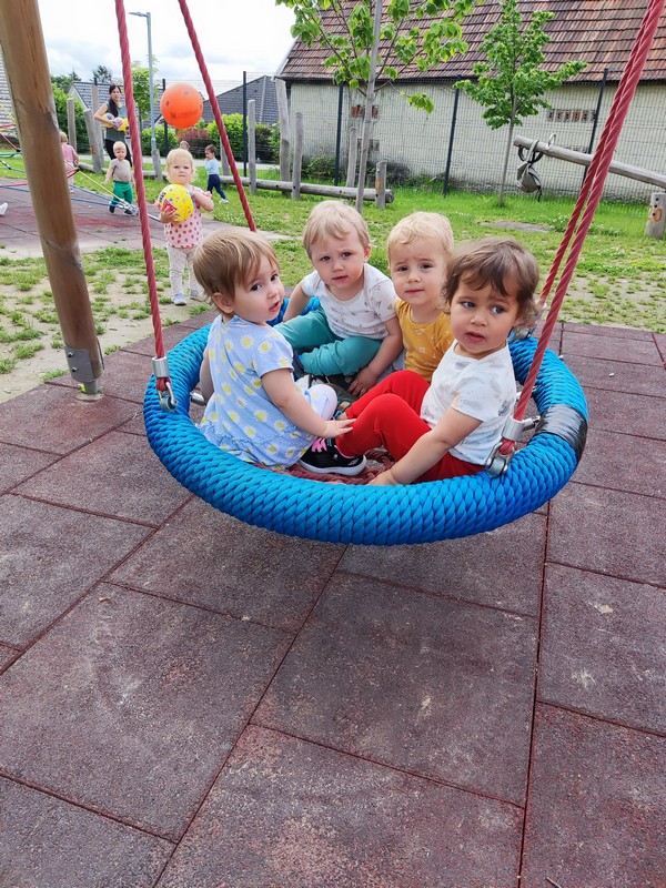 Kadar je bila možnost smo se igrali tudi na igralah ob vrtcu, se plazili ter premagovali različne ovire. Najbolj pa smo uživali na veliki gugalnici – gnezdu.