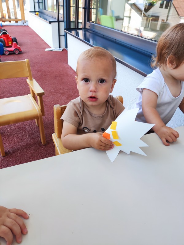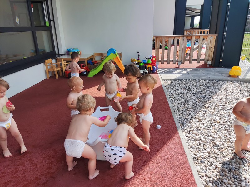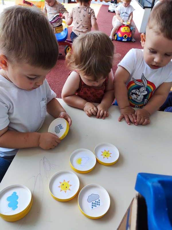 Ko pa je bil sonček za nas že premočan, pa smo se umaknili na teraso, kjer smo nadaljevali z igro z različnimi vozili, ustvarjanjem klobučkov, sončkov, igranjem vremenskega spomina ter seveda vodno zabavo z vodnimi baloni, lovljenjem ribic z mrežico ter poležavanjem na “plaži”.