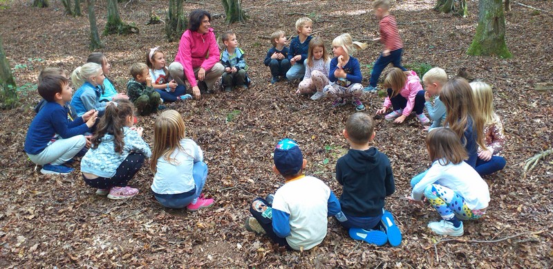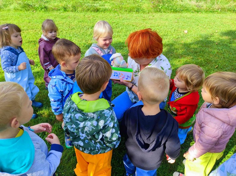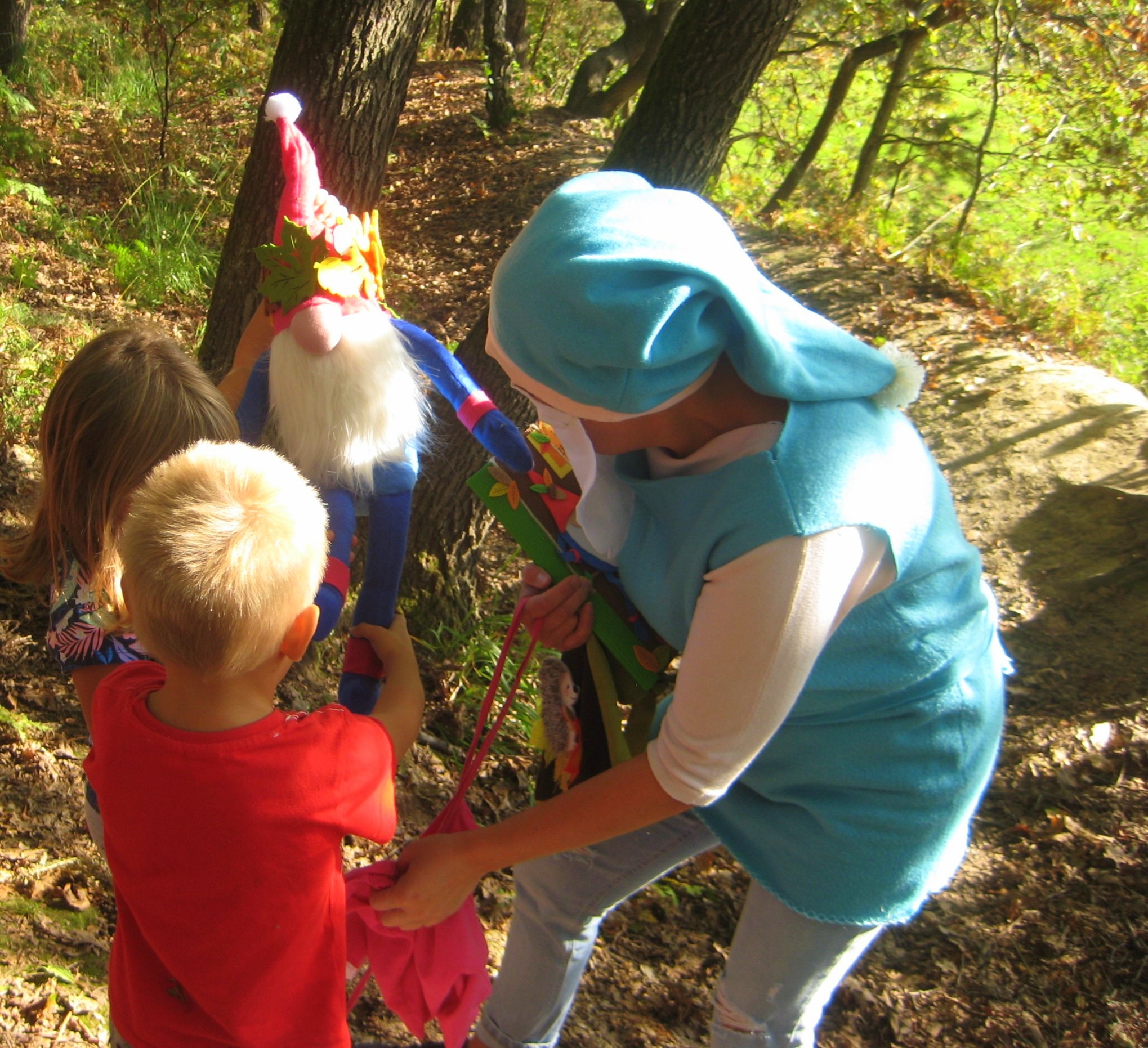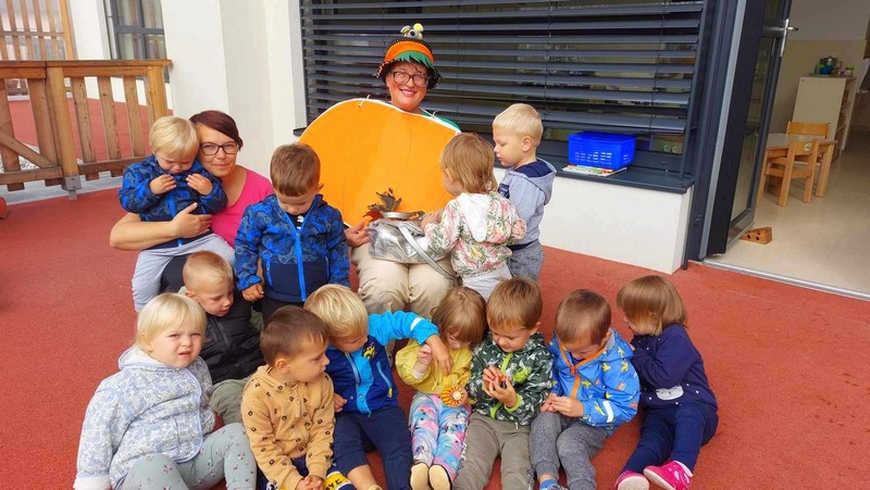 Za konec pa nas je obiskala še Učena Buča s polno košaro jesenskih dobrot, ki nam je tudi zaupala, da se najraje kotali in lovi. Tako so Plezalčki in Navihančki vzeli pot pod noge ter se po hribu kotalili kot žoge in se lovili v igri Gnilo jajce.