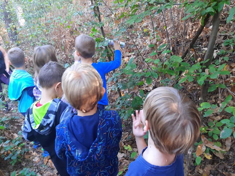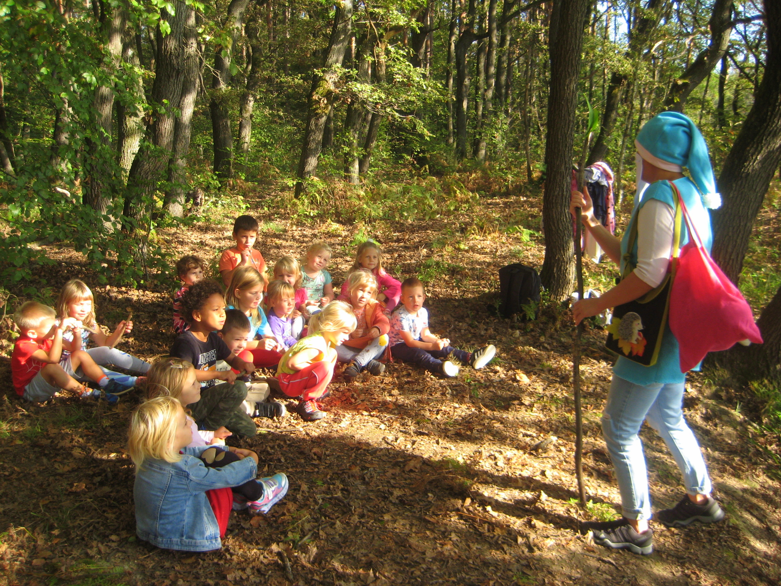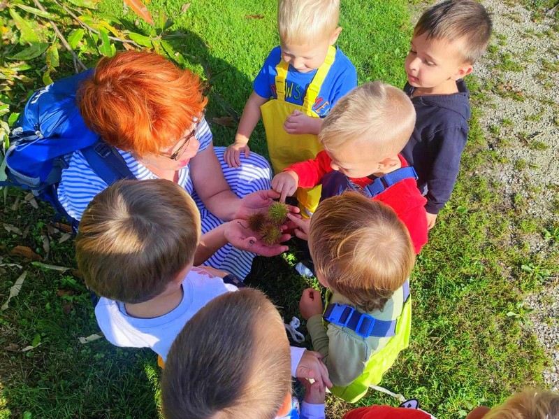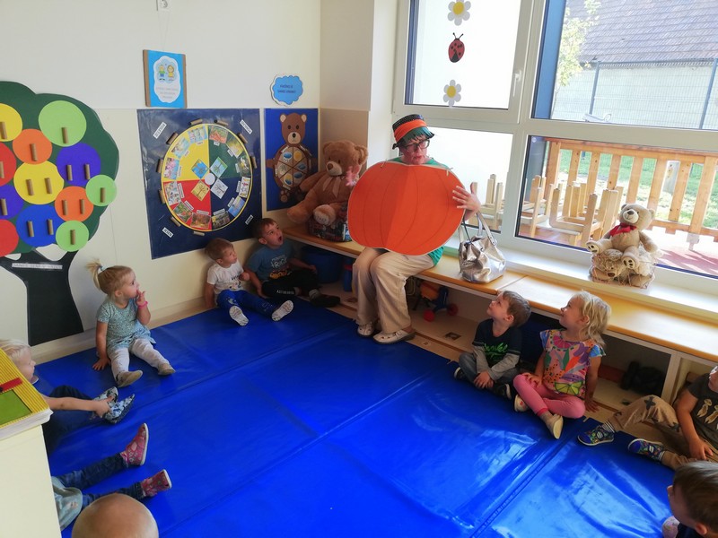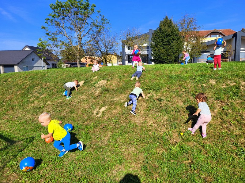 Za konec pa nas je obiskala še Učena Buča s polno košaro jesenskih dobrot, ki nam je tudi zaupala, da se najraje kotali in lovi. Tako so Plezalčki in Navihančki vzeli pot pod noge ter se po hribu kotalili kot žoge in se lovili v igri Gnilo jajce.