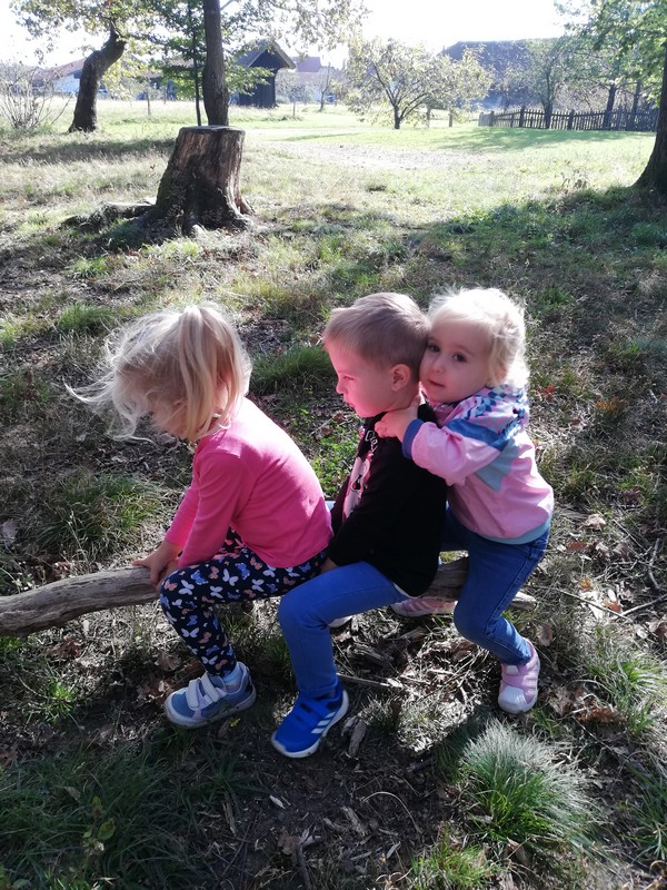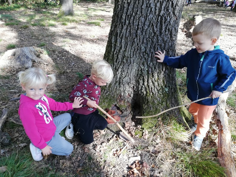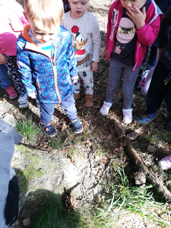 »Ooo, jaz pa vidim nekaj zanimivega pri starem štoru, »pravi vzgojiteljica. In kaj se zgodi? Otroci nemudoma pritečejo in skupaj pozorno opazujemo različne prebivalce gozda. Vedno se razvije pogovor in sto vprašanj, ki se porajajo našim vedoželjnim otrokom. Tokrat smo odkrili izgubljenega močerada. A le za kratek čas, saj si je našel zatočišče v drevesni luknji.