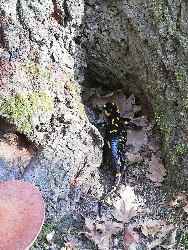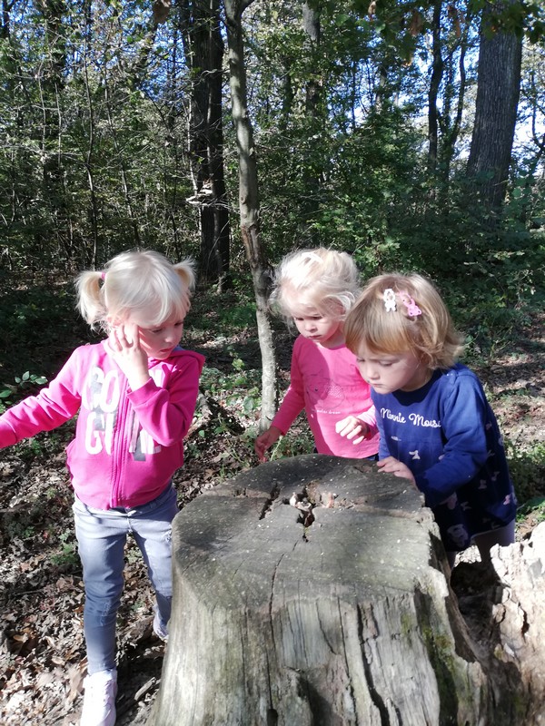 »Ooo, jaz pa vidim nekaj zanimivega pri starem štoru, »pravi vzgojiteljica. In kaj se zgodi? Otroci nemudoma pritečejo in skupaj pozorno opazujemo različne prebivalce gozda. Vedno se razvije pogovor in sto vprašanj, ki se porajajo našim vedoželjnim otrokom. Tokrat smo odkrili izgubljenega močerada. A le za kratek čas, saj si je našel zatočišče v drevesni luknji.