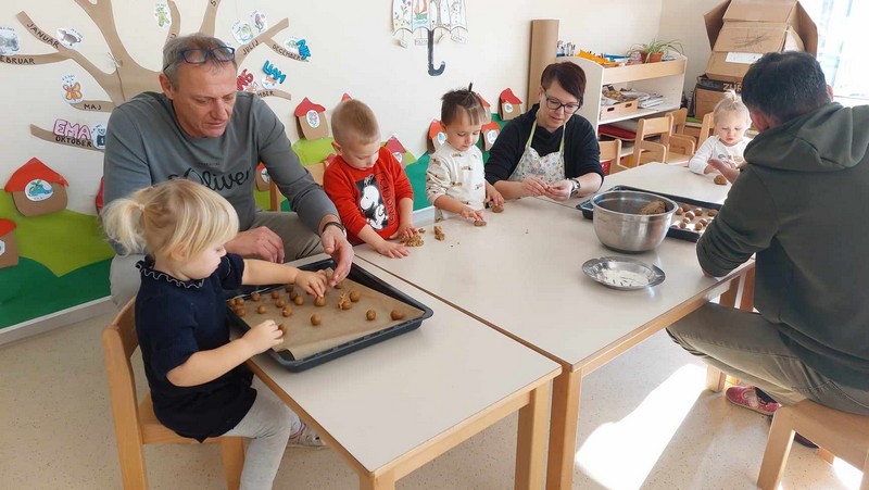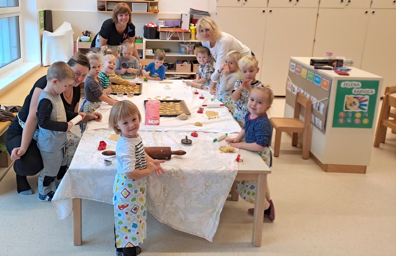 Tudi brez peke prazničnih piškotov ni šlo. Iz otroške kuhinje je zadišalo po medenjakih in jabolčnem zavitku, čokoladnih kroglicah in maslenih piškotih.