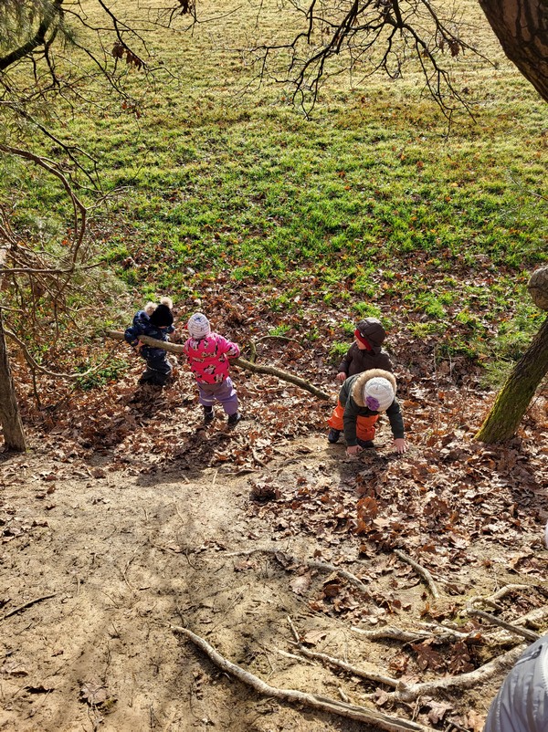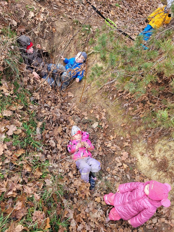 Gozdna igralnica nam ponuja ogromno izkušenj. Zelo radi iščemo in nabiramo naravne materiale, poslušamo, raziskujemo, in opazujemo živali, predvsem radi pa čas preživimo na gozdnem toboganu. Čeprav je neraven teren izredno zahteven imamo takšne izzive najraje, saj s tem urimo vztrajnost.