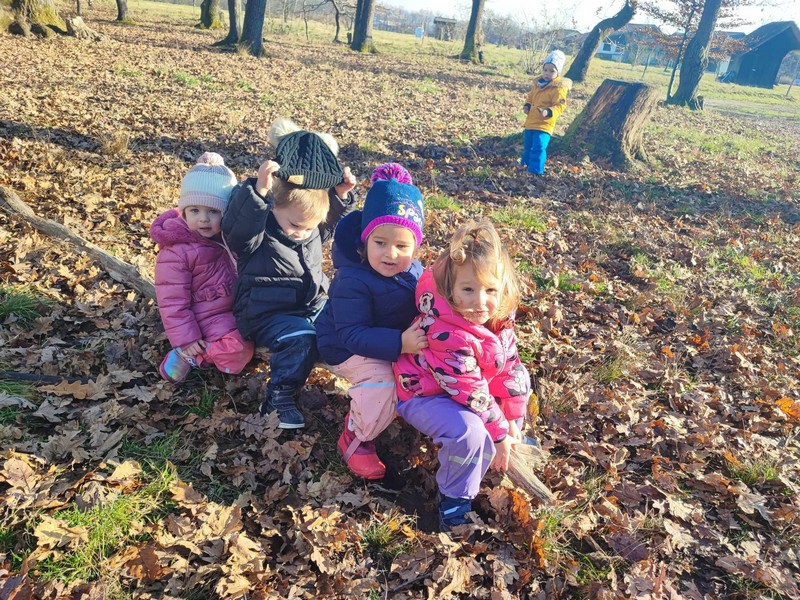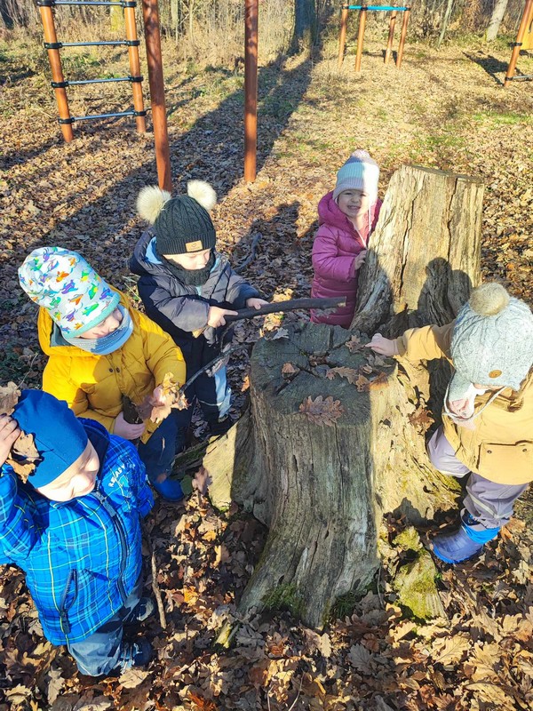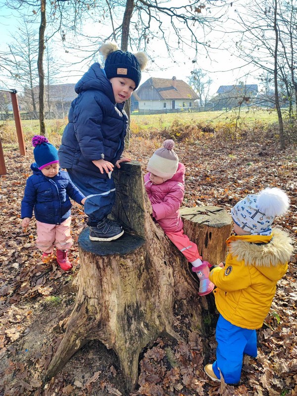 Gozdna igralnica nam ponuja ogromno izkušenj. Zelo radi iščemo in nabiramo naravne materiale, poslušamo, raziskujemo, in opazujemo živali, predvsem radi pa čas preživimo na gozdnem toboganu. Čeprav je neraven teren izredno zahteven imamo takšne izzive najraje, saj s tem urimo vztrajnost.