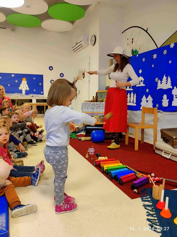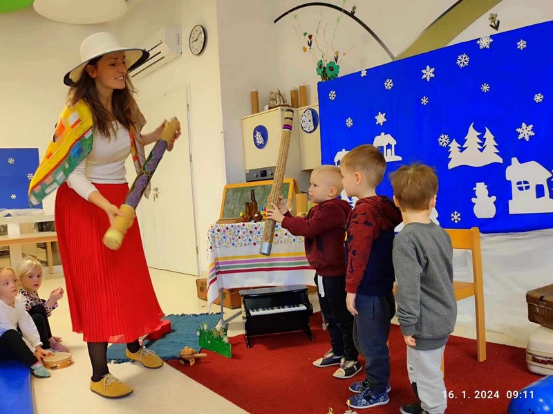 V našem vrtcu smo imeli glasbeno predstavo, kjer je gospa Matej Fi skozi igro predstavila izvirna glasbila in zvočila, zapela različne ljudske in avtorske pesmi ter nam pripovedovala zanimive zgodbe ter dogodivščine. Vse to je prinesla z vseh vetrov, s svojih potovanj in druženj po različnih delih Slovenije in deželah sveta.