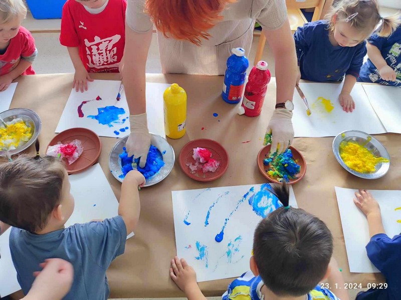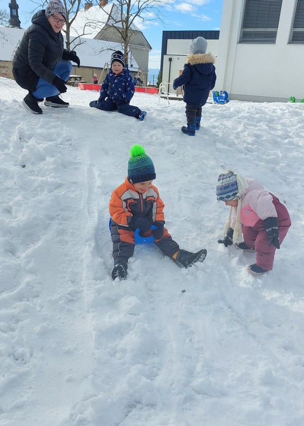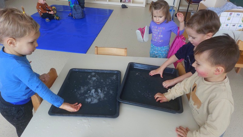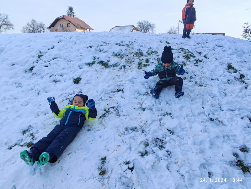 Prvi sneg sva otrokom najprej prinesli v igralnico, zato, da so ga lahko spoznavali z vsemi čutili. Prvemu začudenju je sledilo navdušenje pri večini otrok ali takojšnji umik in opazovanje iz varne razdalje bolj previdnih posameznikov... Ko smo odšli na igrišče, kjer je bil otrokom sneg skoraj do kolen, smo tistega na pekačih pustili v igralnici in kasneje z zanimanjem gledali in predvsem preizkušali, kaj je iz njega nastalo.