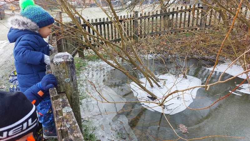Ker sta to za naše 2-3 letne otroke praktično prvi sneg in led, smo ju z zanimanjem raziskovali. Debel led, ki ga boste lahko opazili na fotografijah, je iz peskovnika na našem igrišču. Tega smo lahko prijeli, potipali, polizali ipd... medtem, ko smo tistega na mlaki, pri Banovi hosti lahko samo gledali z očmi...