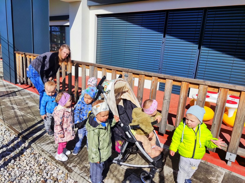 Za njih je gozd še predaleč, zato jim vzgojiteljici ponujava predvsem igro na terasi igralnice, igrišču vrtca in na travniku. Otroci celo šolsko leto na igriv način in skozi praktično raziskovanje spoznavajo rastline, živali, naravne pojave in letne čase, krepijo fizično zdravje in dobro počutje, ter raziskujejo naravne materiale.