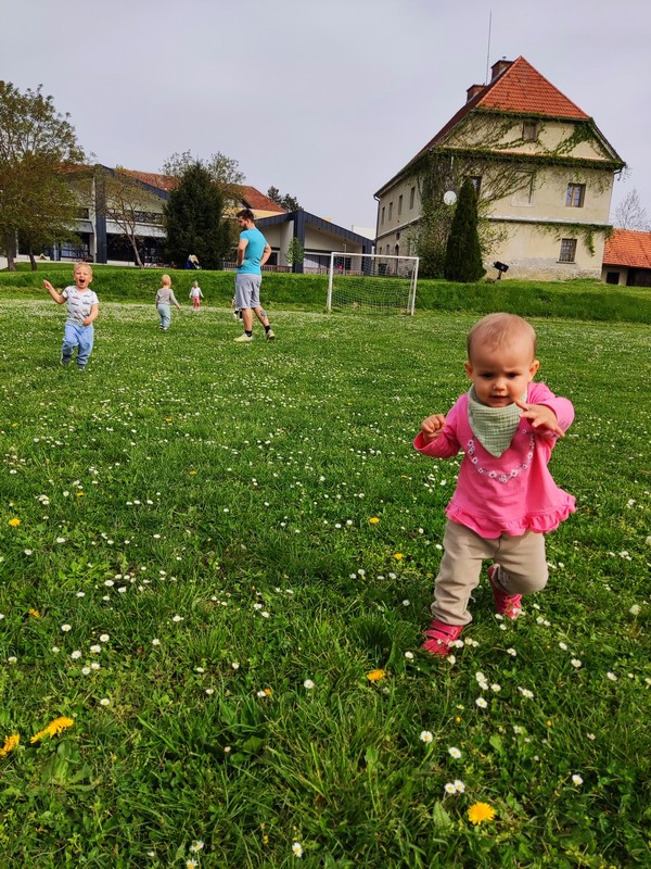 Sedaj, ko je nastopila pomlad pa so otroci že tako veliki in spretni, da lahko odidejo z vrvico na sprehod. Najprej smo opravili krajše sprehode do igrišča vrtca in nazaj na teraso.