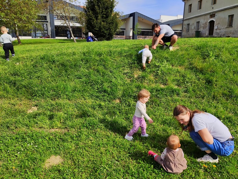 Otroci so ponosno pomahali vrtcu v slovo in se odpravili na pravo malo raziskovanje bližnje okolice. Na travniku se je otrokom odprl novi mali svet. Z obiskom travnika so pridobili nekaj ključnih izkušenj. Otroci so imeli dovolj prostora za prosto tekanje, skakanje, premagovanje ovir, lezenje v hrib in spuščanje navzdol.