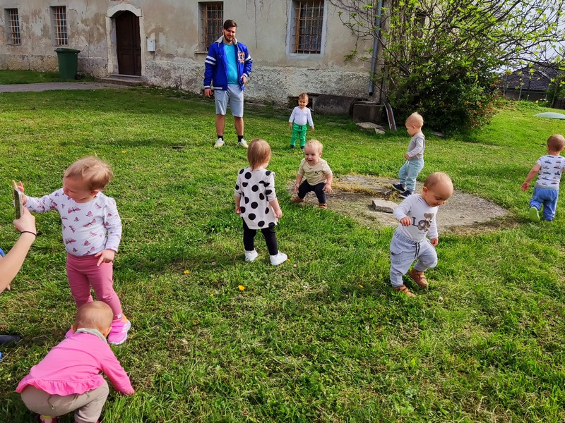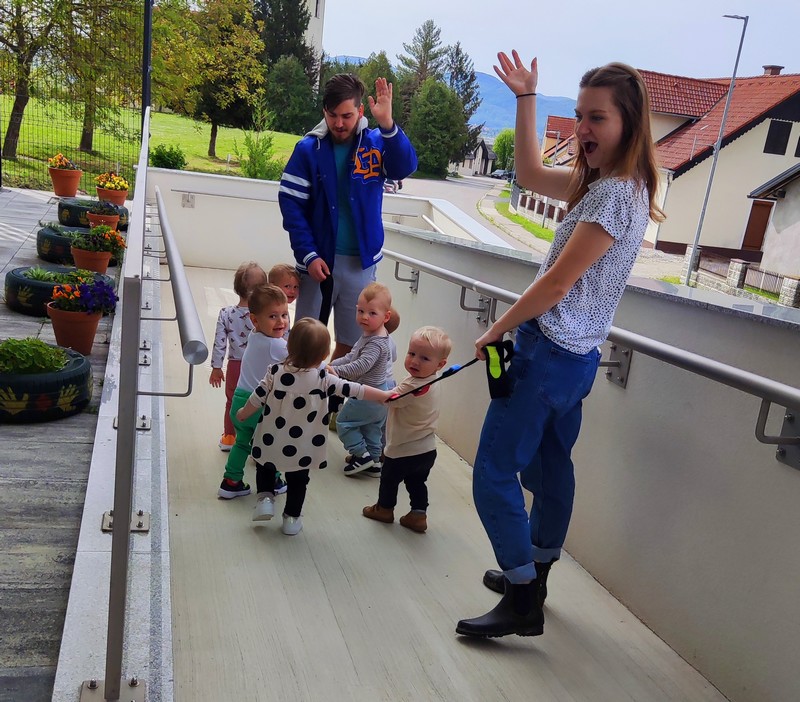 Sedaj, ko je nastopila pomlad pa so otroci že tako veliki in spretni, da lahko odidejo z vrvico na sprehod. Najprej smo opravili krajše sprehode do igrišča vrtca in nazaj na teraso.