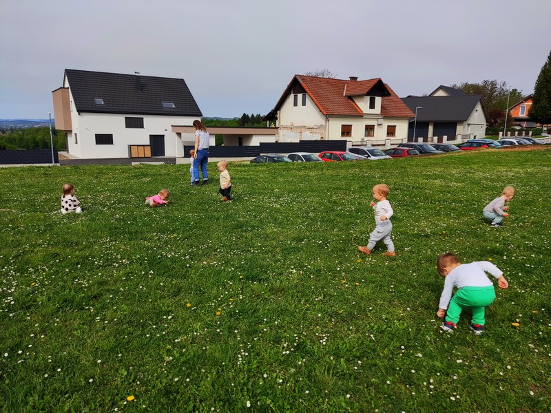Otroci so ponosno pomahali vrtcu v slovo in se odpravili na pravo malo raziskovanje bližnje okolice. Na travniku se je otrokom odprl novi mali svet. Z obiskom travnika so pridobili nekaj ključnih izkušenj. Otroci so imeli dovolj prostora za prosto tekanje, skakanje, premagovanje ovir, lezenje v hrib in spuščanje navzdol.
