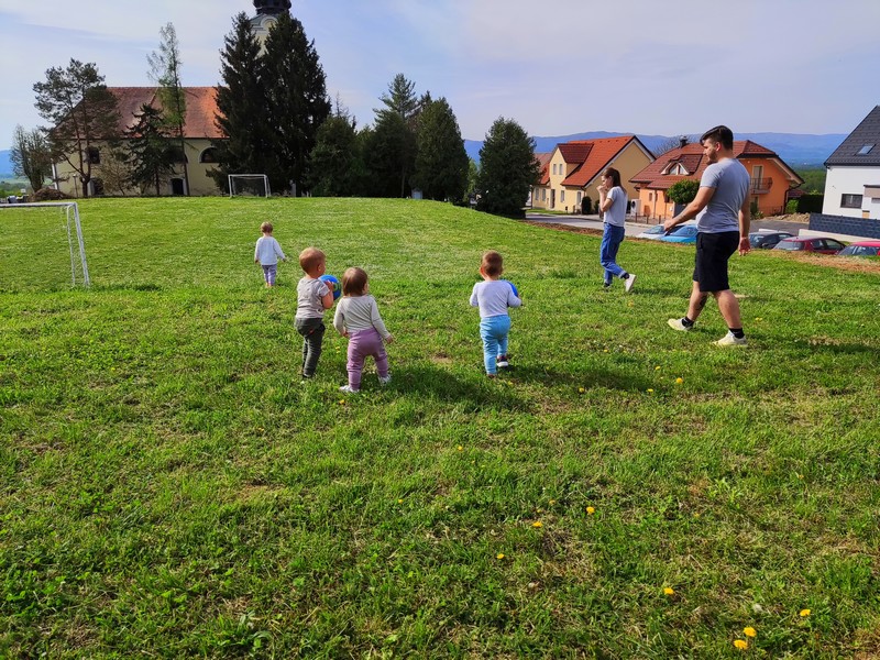 Ko pa smo videli, da so pripravljeni še za kaj več, pa smo se podali na travnik oz. travnato igrišče pri vrtcu (obisk travnika za otroke predstavlja bogato in pomembno izkušnjo, ki vpliva na različna področja njihovega razvoja).