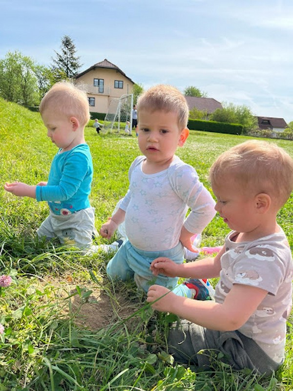 Za njih je gozd še predaleč, zato jim vzgojiteljici ponujava predvsem igro na terasi igralnice, igrišču vrtca in na travniku. Otroci celo šolsko leto na igriv način in skozi praktično raziskovanje spoznavajo rastline, živali, naravne pojave in letne čase, krepijo fizično zdravje in dobro počutje, ter raziskujejo naravne materiale.