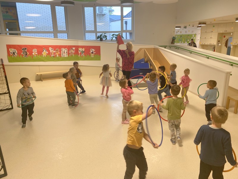 V skupnem prostoru smo si postavili poligon, ter se razgibali z obroči. Zelo zabavna je bila tudi igra SEMAFOR, kjer so obroči postali naši volani, mi pa smo morali upoštevati barve na semaforju: rdeča je pomenila stop, rumena prestopanje na mestu, zelena pa, da se vozimo po prostoru.