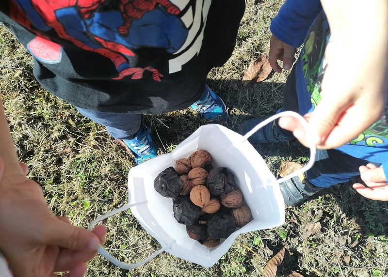 Vendar pa še vedno najraje bivamo zunaj – na travniku, kjer nabiramo orehe, se sprehodimo v okolici vrtca, na igrišču se urimo v hitrostnem tekanju in obiskujemo naš preljubi Banov gozd.