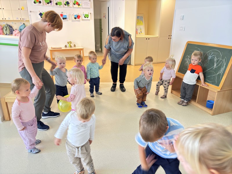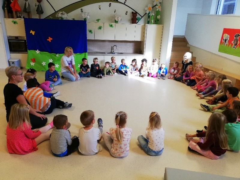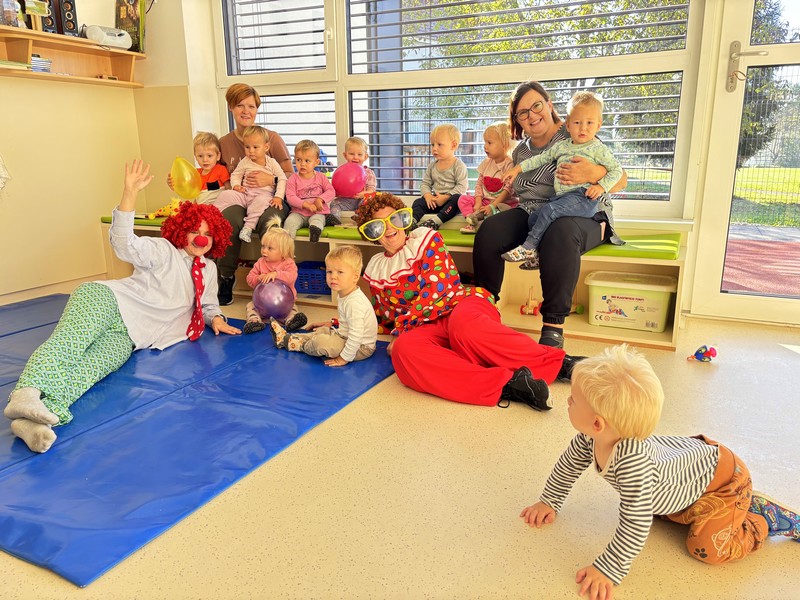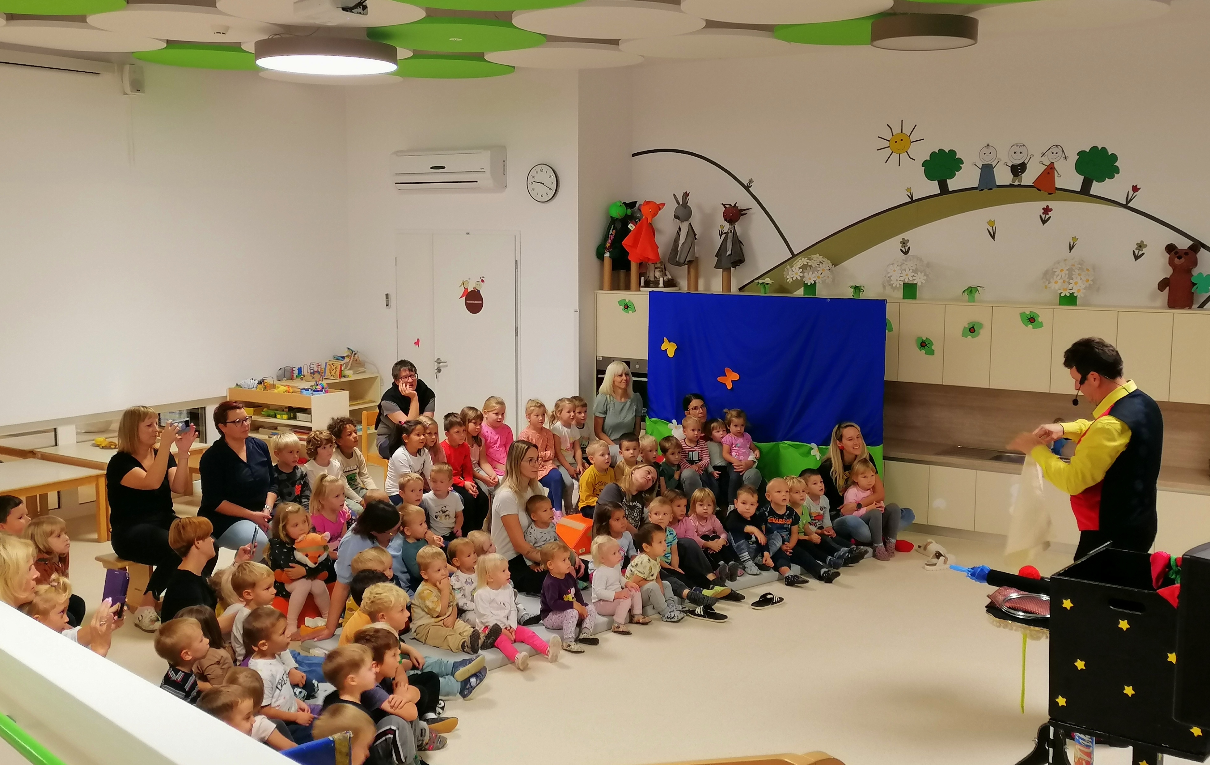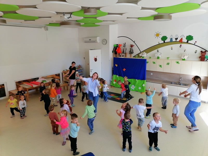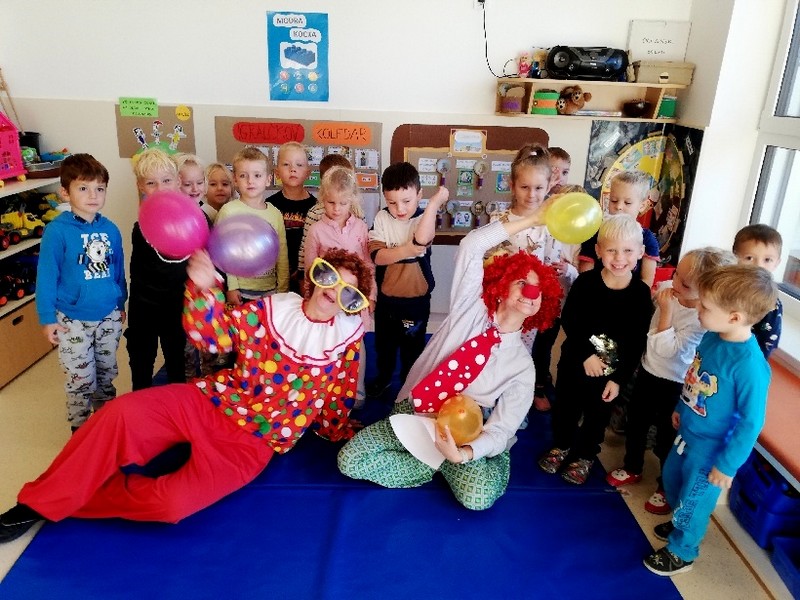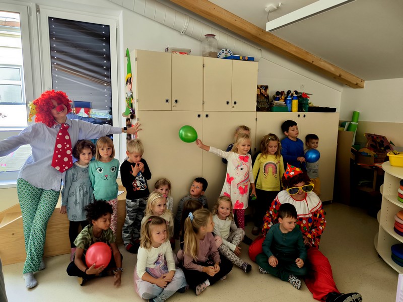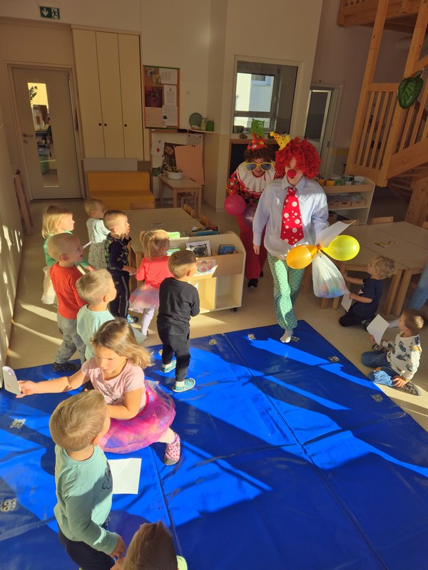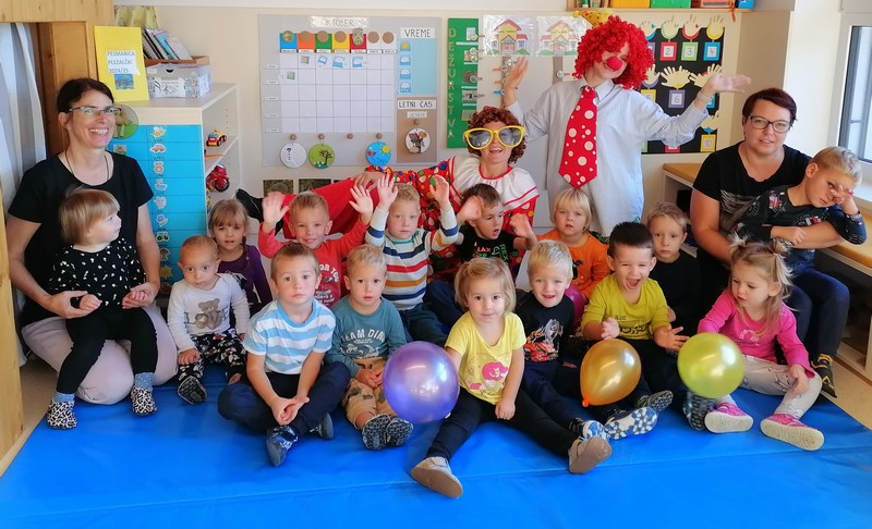 Za začetek sta nas obiskali klovnesi Frida in Zdenka, ki sta s poslanico, baloni in plesom otvorili naše druženje. Ker v našem vrtcu tudi zelo radi pojemo in plešemo, smo v skupnem prostoru zaplesali z drugimi skupinami, preko pravljice improvizirali ples in neizmerno uživali.