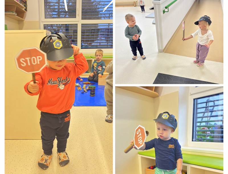 V igralnici smo se prelevili v voznike, policiste in gasilce ter se igrali gibalne igre z obroči. Pripravili smo različne plakate z vozili. Prav tako smo likovno ustvarjali. Slikali smo, tiskali in lepili, da je nastalo vozilo v prometu. Prepevali smo pesmi Kolesa na avtu in K teti v zali log. Ogledovali in prebirali smo slikanice o najrazličnejših vozilih ter se učili prometnega pravila STOP.
