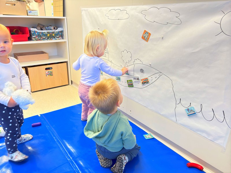 V igralnici smo se prelevili v voznike, policiste in gasilce ter se igrali gibalne igre z obroči. Pripravili smo različne plakate z vozili. Prav tako smo likovno ustvarjali. Slikali smo, tiskali in lepili, da je nastalo vozilo v prometu. Prepevali smo pesmi Kolesa na avtu in K teti v zali log. Ogledovali in prebirali smo slikanice o najrazličnejših vozilih ter se učili prometnega pravila STOP.