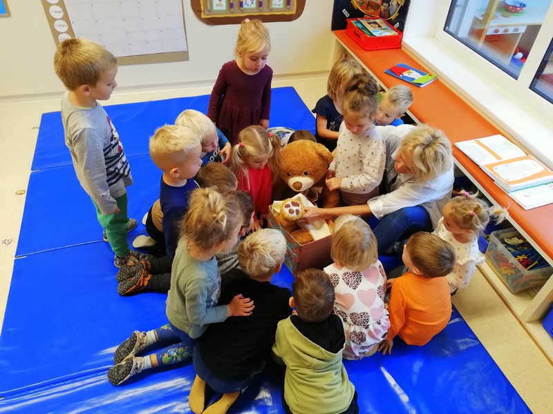 ... in tako je končno napočil trenutek, ko je med nas prišel prikupni medvedek Uhec, ki je postala naša maskota oddelka. Zares smo se ga razveselili in ga z veseljem povabili med nas. Verjamemo, da mu bodo vikendi polni, novih dogodivščin.