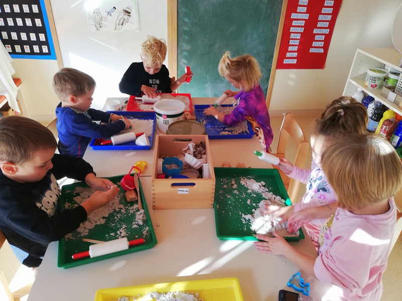 Naši prstki uživajo ob gnetenju plastelina in kinetičnega peska. Radi pa se tudi pozabavamo z risanjem.