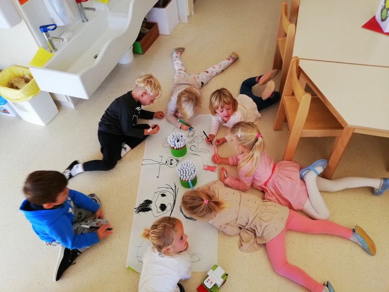 Naši prstki uživajo ob gnetenju plastelina in kinetičnega peska. Radi pa se tudi pozabavamo z risanjem.