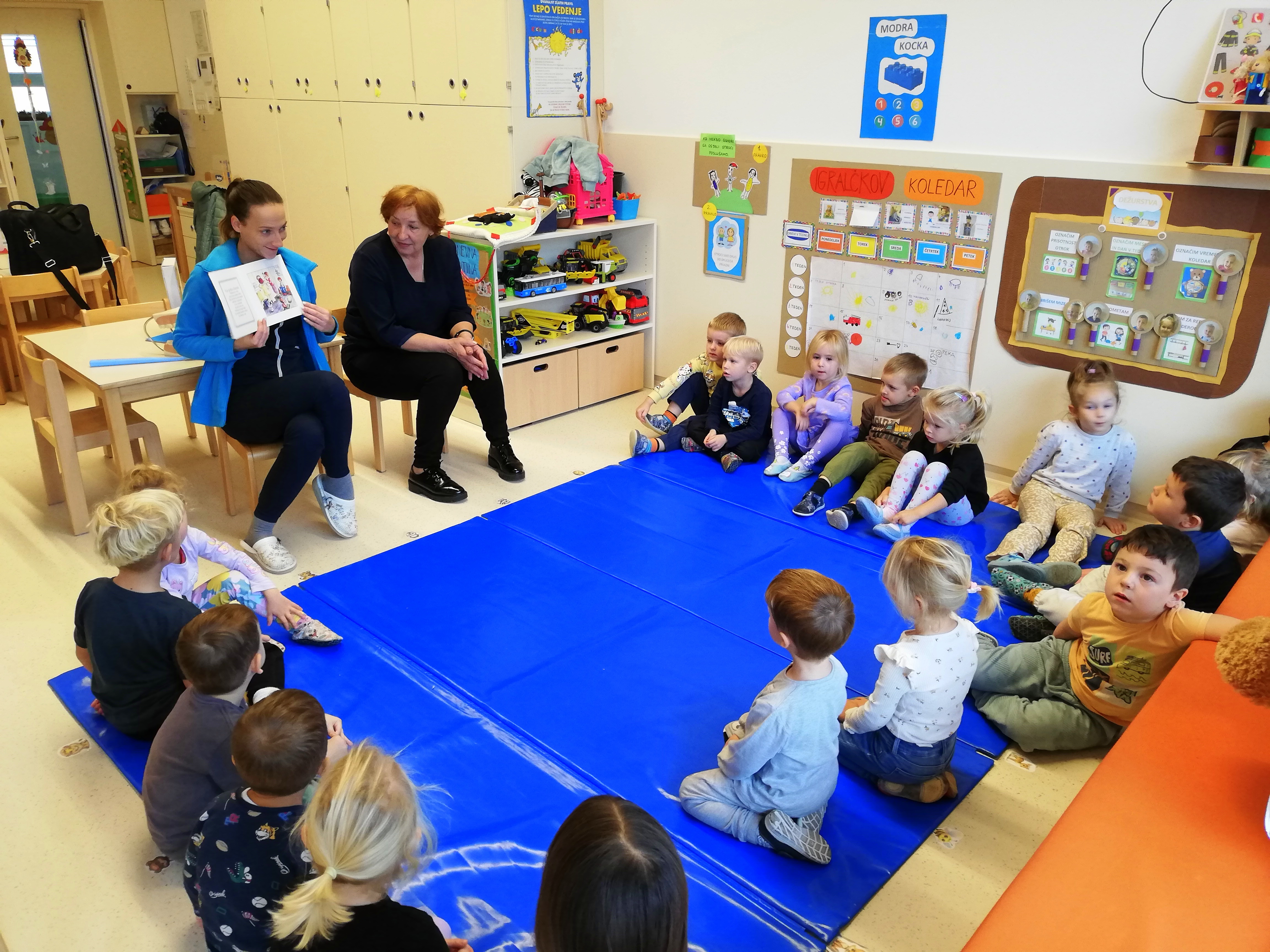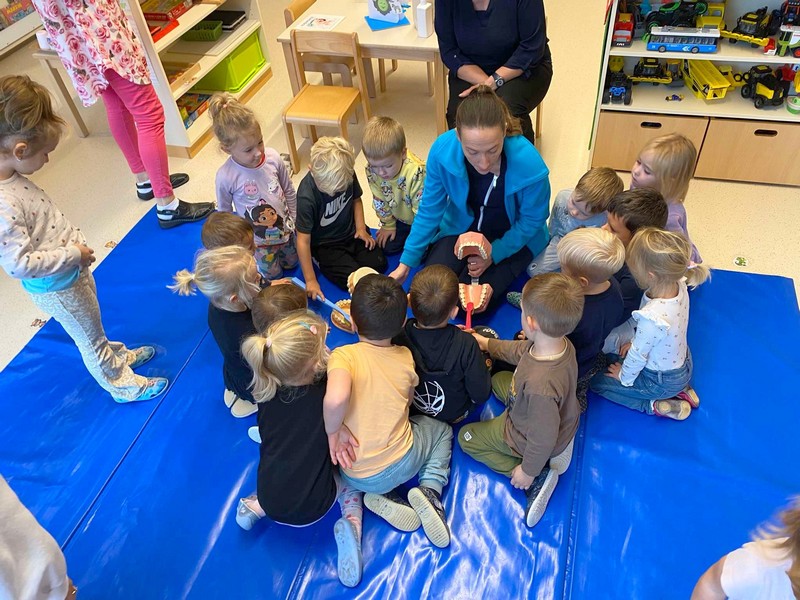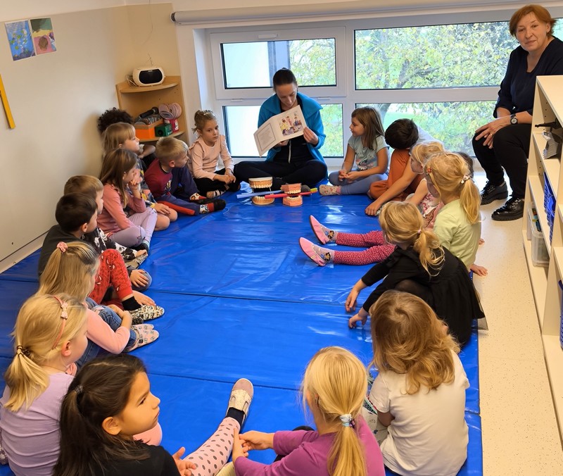 Naslednji del srečanja je bil namenjen skrbi za zobe. Sestri sta otrokom predstavili zgodbo o zobni miški, skozi katero so se naučili, zakaj je treba redno ščetkati zobke – tako zjutraj kot zvečer. S sabo sta imeli tudi model zob, na katerem so otroci lahko sami preizkusili ščetkanje. Ob tem so se naučili pravilne tehnike, saj sta medicinski sestri Alja in Milka korak za korakom pokazali, kako s ščetkanjem odstranimo ostanke hrane in preprečimo nastanek zobnih oblog.