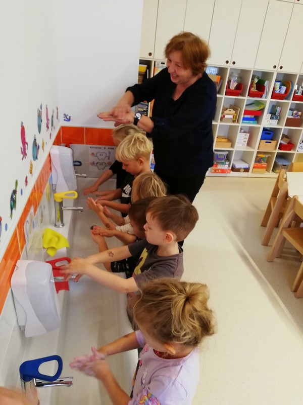 Medicinski sestri sta otrokom najprej predstavili pravilno umivanje rok. Razložili sta jim, zakaj je umivanje rok tako pomembno – pred obroki, po obrokih, po uporabi stranišča in po različnih dejavnostih, kjer se otroci srečujejo z bakterijami in virusi. Skupaj so preizkusili in ponovili tehniko temeljitega umivanja rok, pri čemer so se otroci zabavali ter se naučili, kako lahko z rednim umivanjem poskrbijo za svoje zdravje.